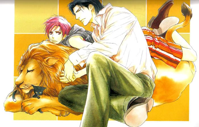 Also went for Yamimaru Enjin's Voice or Noise Volume 1 & 2 (from 2003-2005). This is/was being scanlated by Hochuuami/Loveless (y'know...the speedy ppl..2 chapters are at hochuuami.com). The manga is a soft yaoi version of Dr. Dolittle. I tend to enjoy soft yaoi since there is usually a plot (however dorky it may be) and there at least 2 hot guys..and very few if any, females. Voice and Noise about a young boy who has a sick dog. Through the advice of his vet, he goes to a cranky college professor who is known to talk to animals. The boy may turn out to have the same talent. Angst, humor and cuddly moments follow. (here and here are a couple scans....hmm, s'not nice how photobucket resized the color pix...time for a new free host.)++